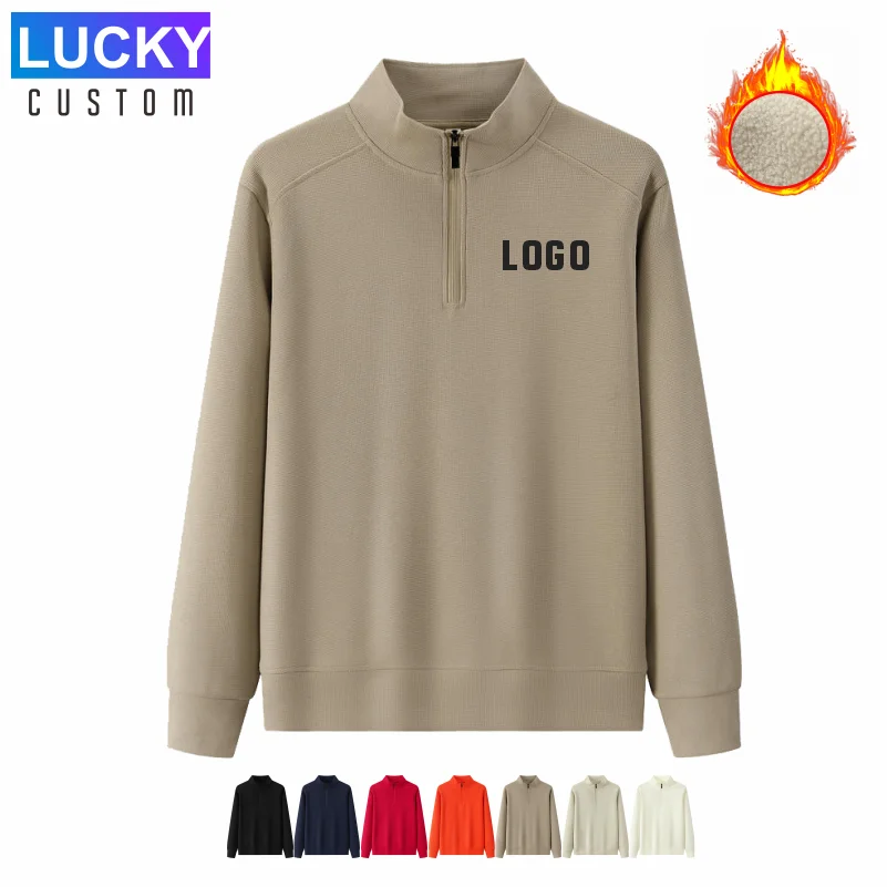 Moletom masculino com zíper frontal meia-zip, plush grosso e mangas longas. Personalize com seu logotipo para roupas de calor, unissex e uniformes de grupo.